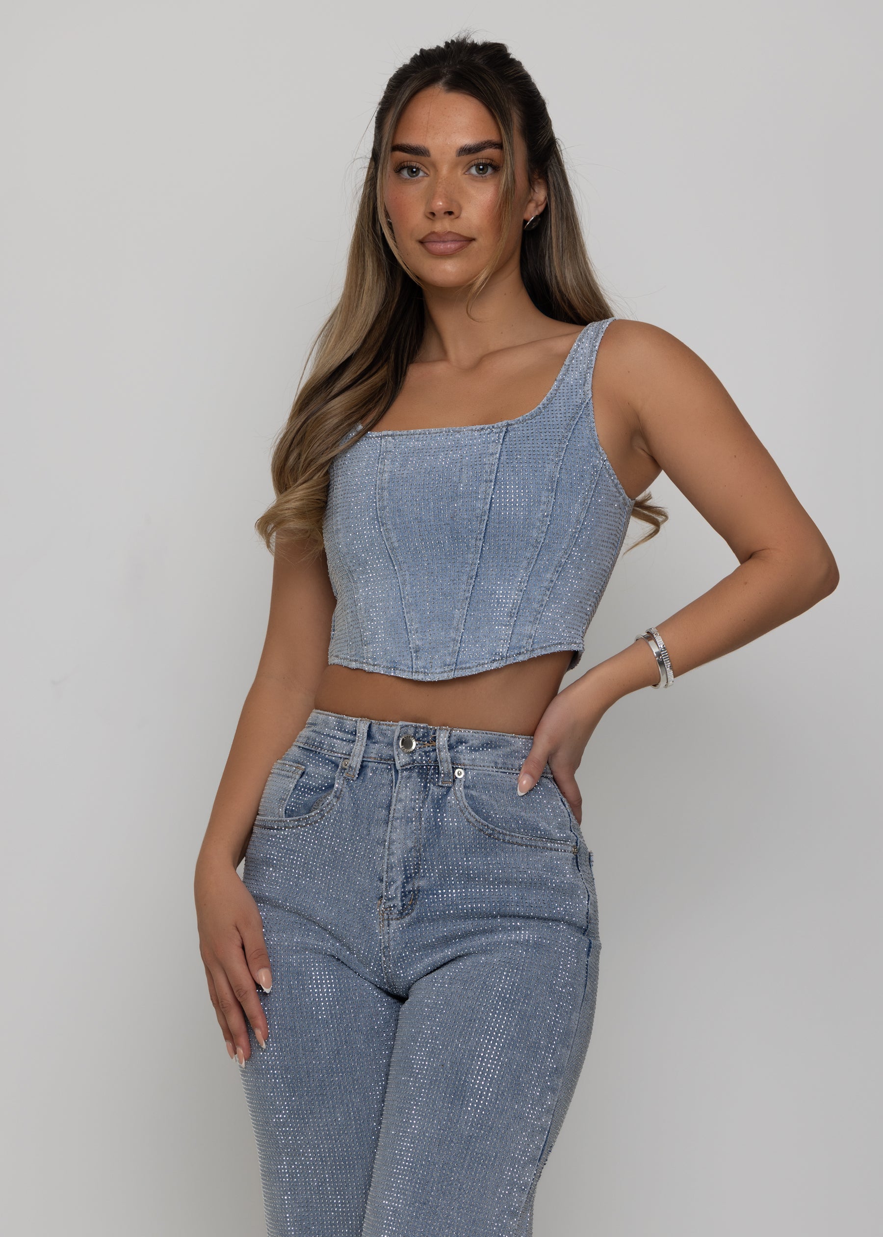 Bold and unapologetically glamorous, the Forever Sparkle corset top is made to shine. Crafted from structured denim, this cropped silhouette features a corset-inspired design that contours the body, elevated with all-over diamante embellishments for a dazzling finish. An elasticated panel at the back ensures a comfortable, flexible fit without compromising on shape. Perfect for nights out and statement styling, Forever Sparkle brings instant sparkle to any look. Pair it with the matching Forever Sparkle jeans for a coordinated set that delivers maximum impact.
