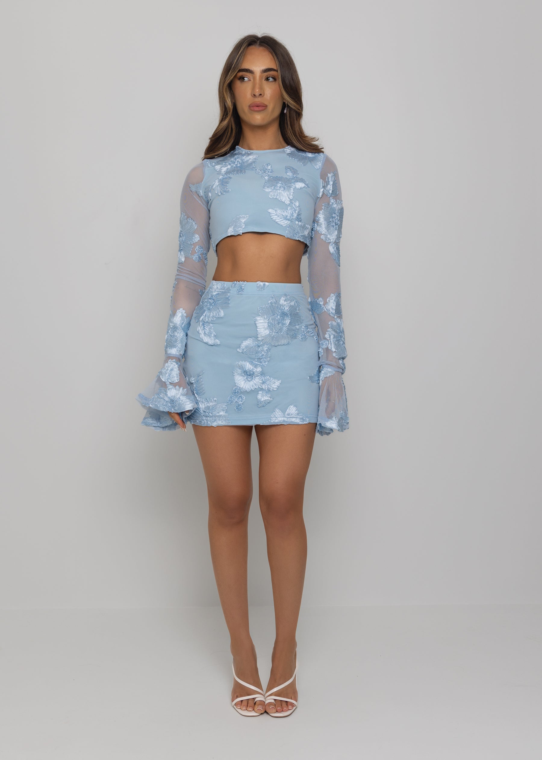 Unleash your inner goddess with our 'Love Ignited' blue two piece! Made from luxurious pastel blue embroidered mesh fabric, this two piece set features a stunning crop top with flared long sleeves that add a touch of drama to your look. Paired with a matching mini skirt, this co-ord is perfect for date nights and special occasions, ignite the passion in this alluring blue co-ord.