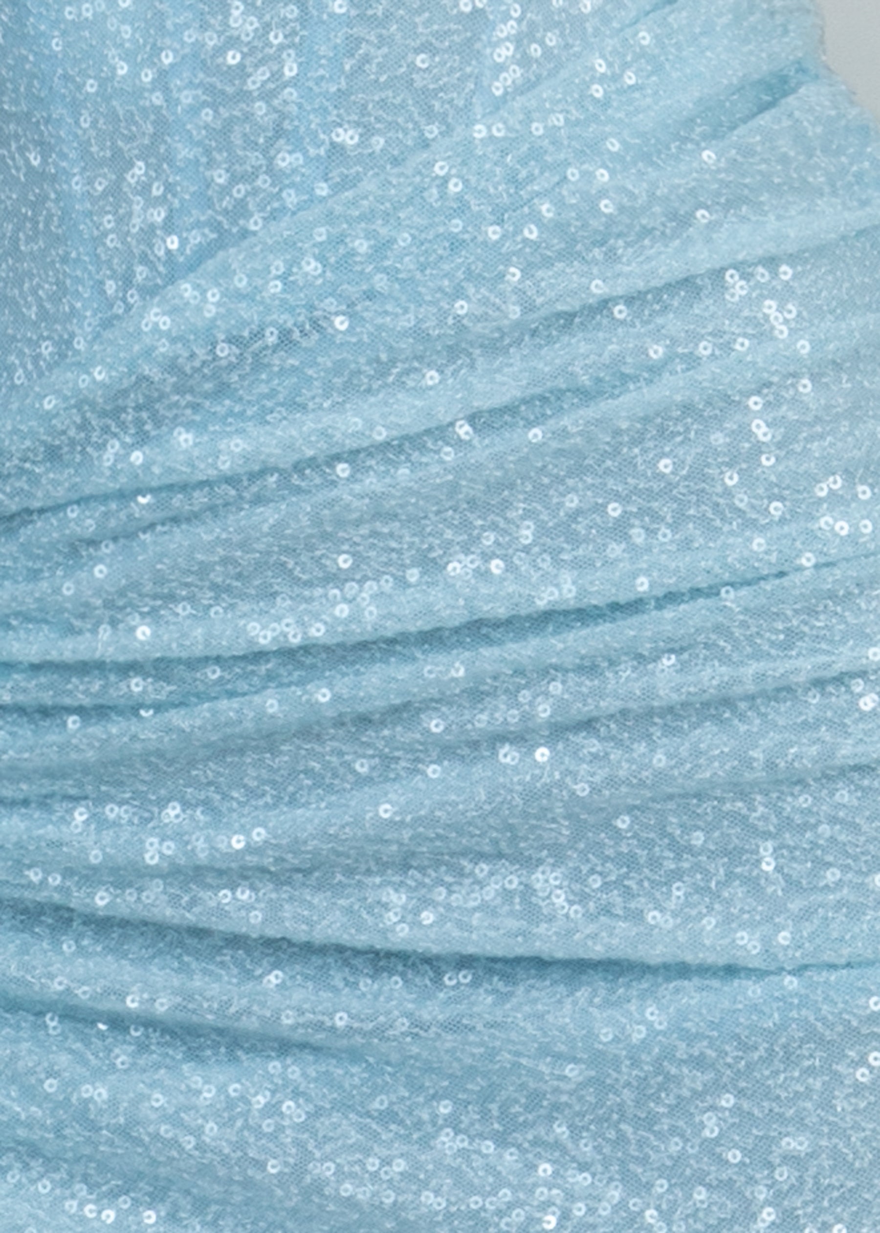 Indulge in the ultimate romantic fantasy with our 'Beauty Treasure' Blue Strapless Gown. Designed with a stunning corset style bodice and a thigh split, this sequin dress will accentuate your curves while the drape detail adds an elegant touch. Made with premium sequin fabric, this gown is the epitome of luxury and sophistication.