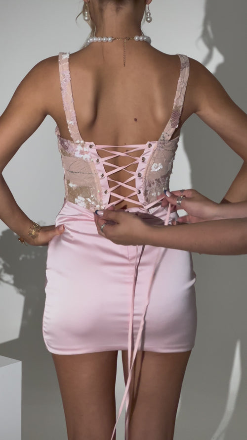 Step into a fairytale with Enchanted Charm, a captivating mini dress that combines delicate detail with modern romance. The bodice features a floral-effect corset design, artfully sculpted to flatter with soft structure and feminine elegance. A functional lace-up back adds allows for a customizable, cinched fit. Below a beautiful pink hugs the body in a sleek bodycon silhouette, finished with a dramatic cowl effect that adds fluidity and elegance to a style meant for making memories and standing out in the crowd.