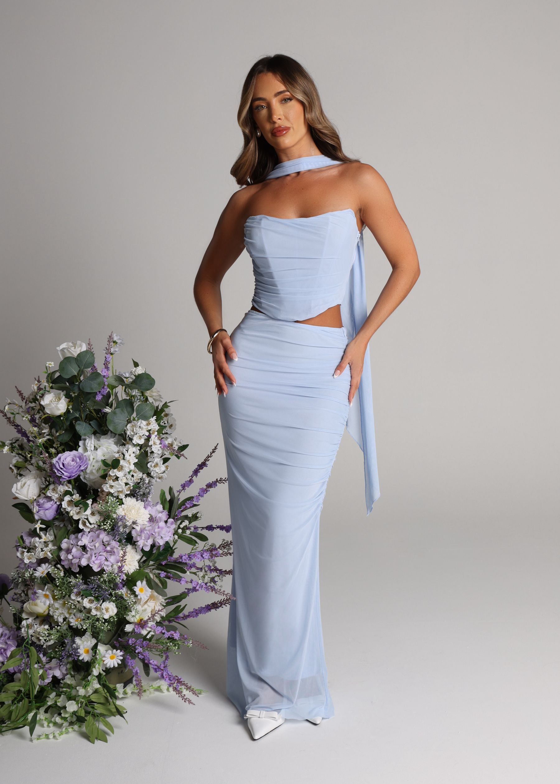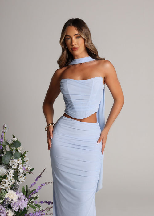 Elevate your style game with our Finding My Power Two Piece with Neck Scarf! Featuring a figure-flattering corset style top and a stunning maxi skirt made from airy mesh fabric, this set is perfect for making a statement. The included neck scarf adds a touch of elegance to complete the look. Empower yourself and stand out in this bold blue ensemble!